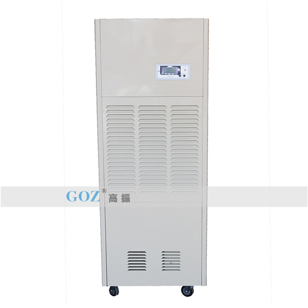 高振商用除濕機通過風(fēng)機將潮濕空氣抽入機器內(nèi)部,通過壓縮機制冷將蒸發(fā)器降溫至露點以下,潮濕空氣經(jīng)過蒸發(fā)器在表面凝結(jié)成水,匯集至接水盤后,流入水箱中,干爽空氣經(jīng)冷凝器重新加熱由出風(fēng)口排出,這樣不斷循環(huán)將室內(nèi)濕度降低。