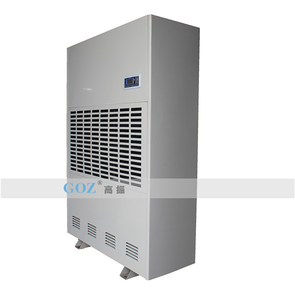 高振商用除濕機(jī)通過風(fēng)機(jī)將潮濕空氣抽入機(jī)器內(nèi)部,通過壓縮機(jī)制冷將蒸發(fā)器降溫至露點(diǎn)以下,潮濕空氣經(jīng)過蒸發(fā)器在表面凝結(jié)成水,匯集至接水盤后,流入水箱中,干爽空氣經(jīng)冷凝器重新加熱由出風(fēng)口排出,這樣不斷循環(huán)將室內(nèi)濕度降低。