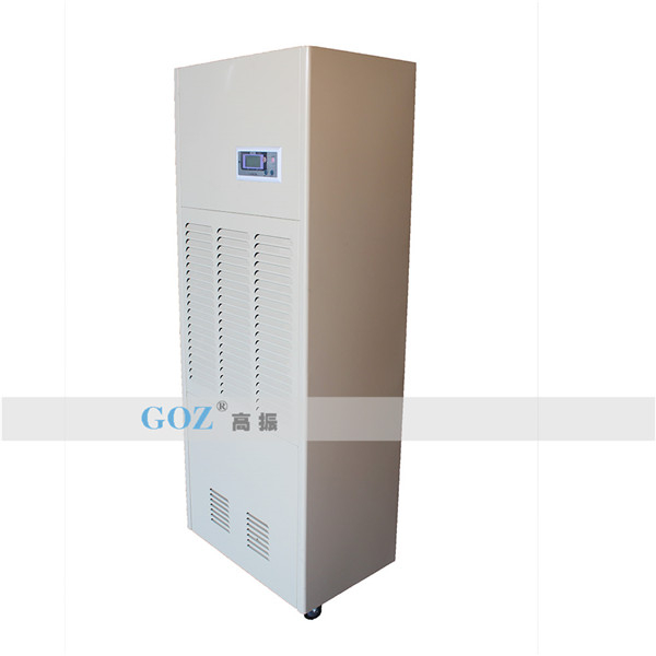 高振商用除濕機通過風(fēng)機將潮濕空氣抽入機器內(nèi)部,通過壓縮機制冷將蒸發(fā)器降溫至露點以下,潮濕空氣經(jīng)過蒸發(fā)器在表面凝結(jié)成水,匯集至接水盤后,流入水箱中,干爽空氣經(jīng)冷凝器重新加熱由出風(fēng)口排出,這樣不斷循環(huán)將室內(nèi)濕度降低。