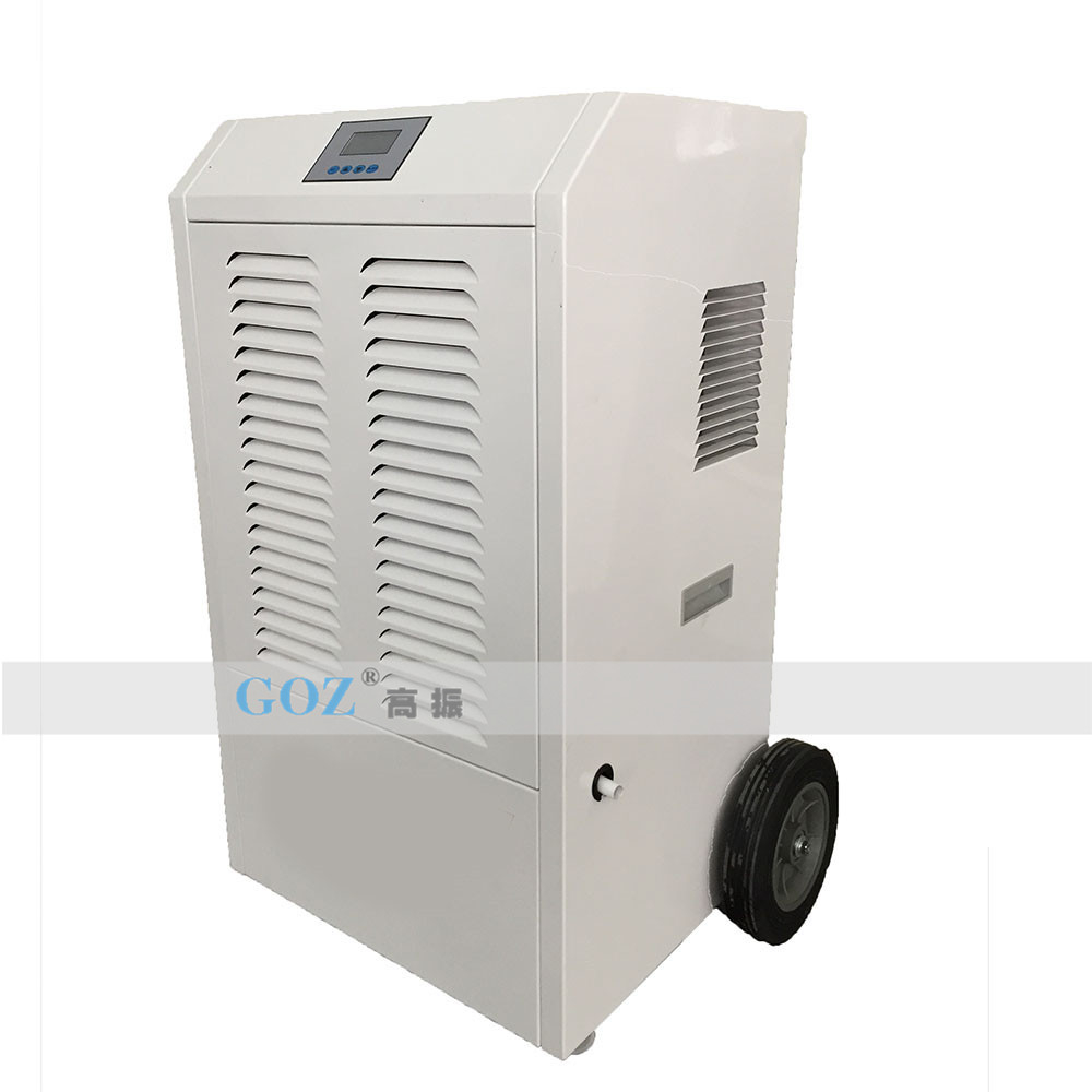 高振手推車除濕機(jī)通過風(fēng)機(jī)將潮濕空氣抽入機(jī)器內(nèi)部,通過壓縮機(jī)制冷將蒸發(fā)器降溫至露點(diǎn)以下,潮濕空氣經(jīng)過蒸發(fā)器在表面凝結(jié)成水,匯集至接水盤后,流入水箱中,干爽空氣經(jīng)冷凝器重新加熱由出風(fēng)口排出,這樣不斷循環(huán)將室內(nèi)濕度降低。